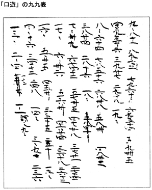 日本での「九九」の最も古い文献は「口遊(くちずさみ)」(970年、源為憲法<ためのり>が貴族の子弟教育として編集した本)で「九九八十一」から記してあるのです。だから、一けたのかけ算を「九九」というのです。